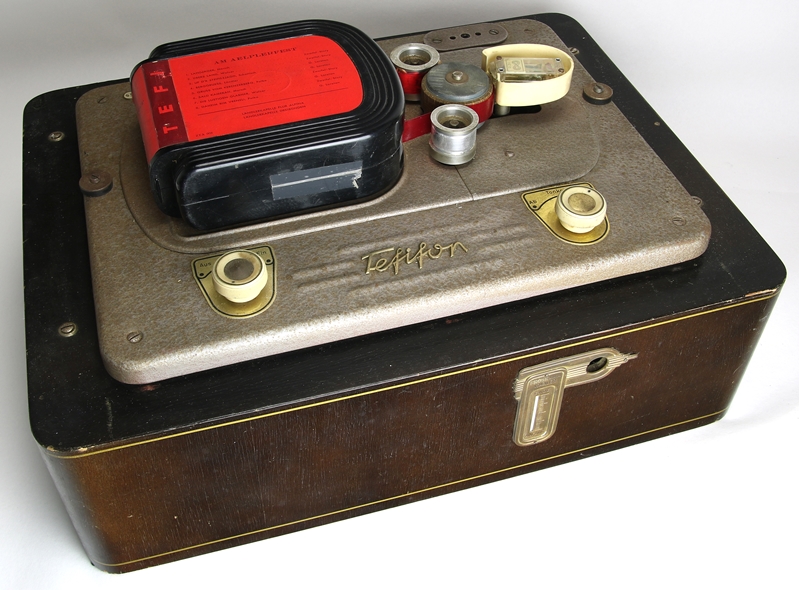 Abspielgerät Typ HS-AT und 12 Schallbänder (eine defekt). Größe des Geräts ca. 44 x 33 x 19 cm. Gewicht ca. 12,2 Kilogramm. Nicht geprüft.