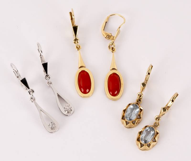 Gold 585. Ein Gelbgoldpaar mit Korallen-Cabochons, ein Gelbgoldpaar mit synthetischen Spinellen und ein Weißgoldpaar mit je einem Diamanten. Länge je ca. 4 cm. Gesamtgewicht ca. 7,9 Gramm. (A55)