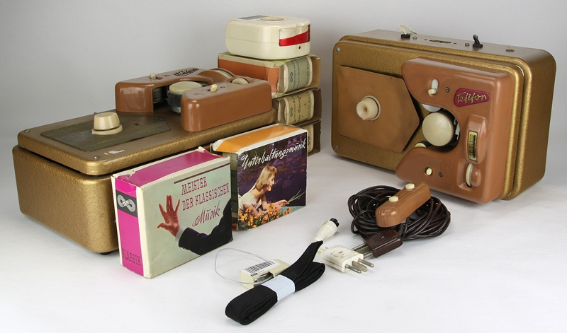 2 x Abspielgerät Typ KC-1/Ra und 6 Schallbänder. Größe der Geräte ca. 29 x 18 x 15 cm. Gewicht ca. 9,6 Kilogramm. Nicht geprüft.