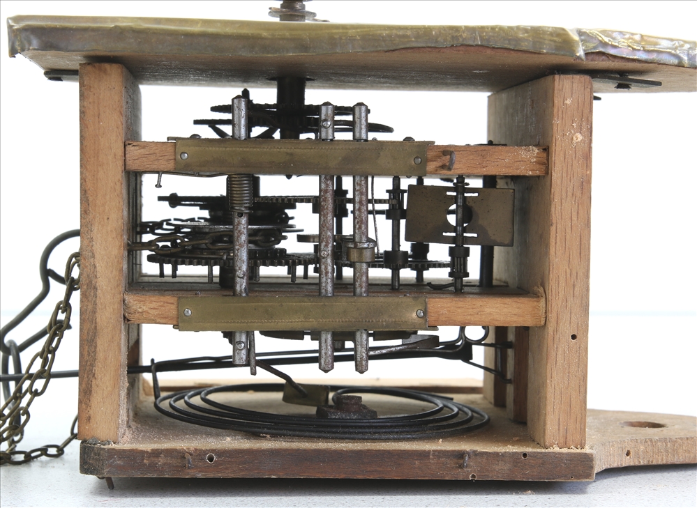 Wohl deutsch 19. Jh. Geprägtes Metallschild mit floralen Elementen. Pendulenwerk mit Schlag zur vollen Stunde auf Tonfeder. Gefüllte Messinggewichte und Scheibenpendel. Größe ca. 12 x 12,5 cm, Höhe ca. 17 bzw. 21 cm. Altersbedingter Zustand wie abgebildet, nicht geprüft.