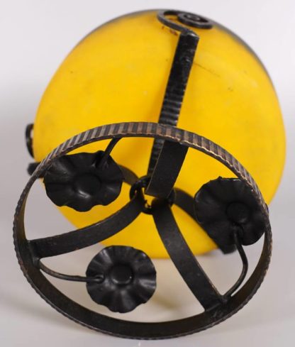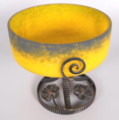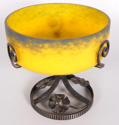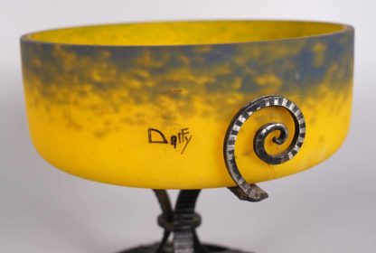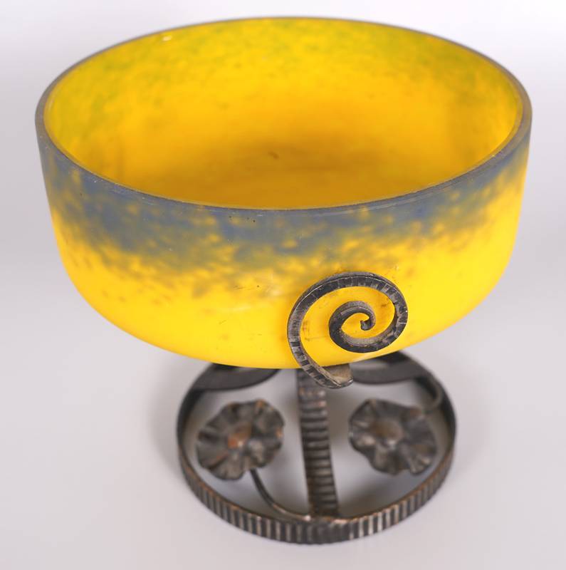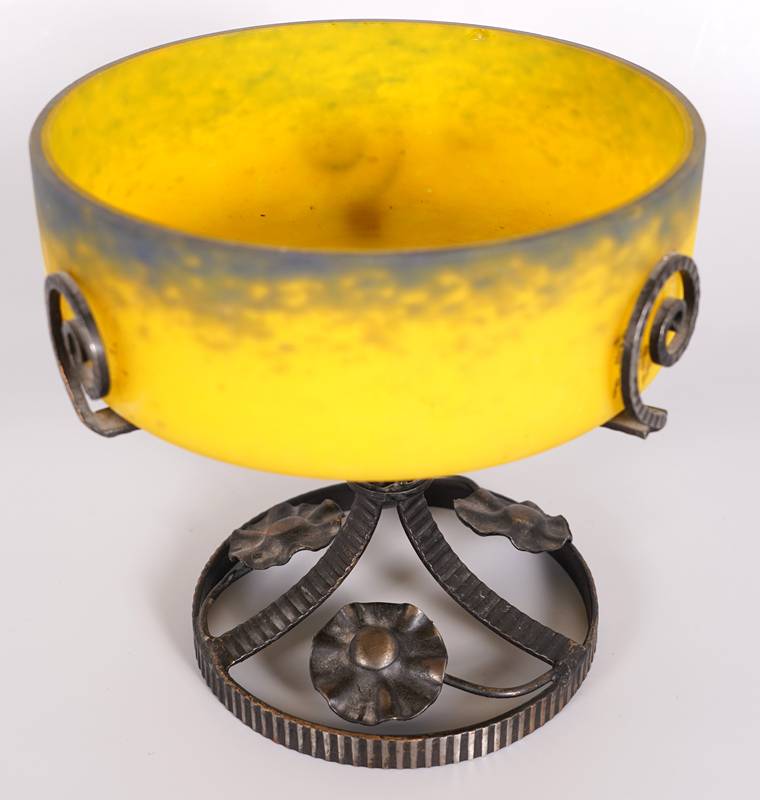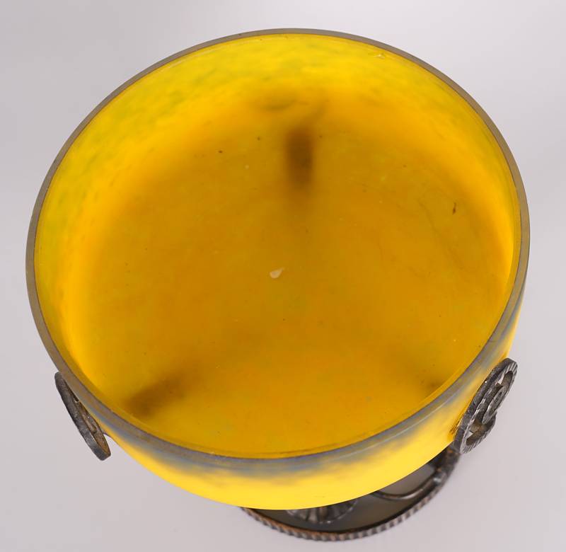 Jugendstil Tafelaufsatz Wohl Frankreich um 1900. Gelbe Glasschale mit dunklen Pulvereinschmelzungen auf Metallständer mit floralem Dekor. Auf der Schale ungedeutete Signatur "Daffy" (?). Durchmesser ca. 20 cm, Höhe ca. 20 cm.