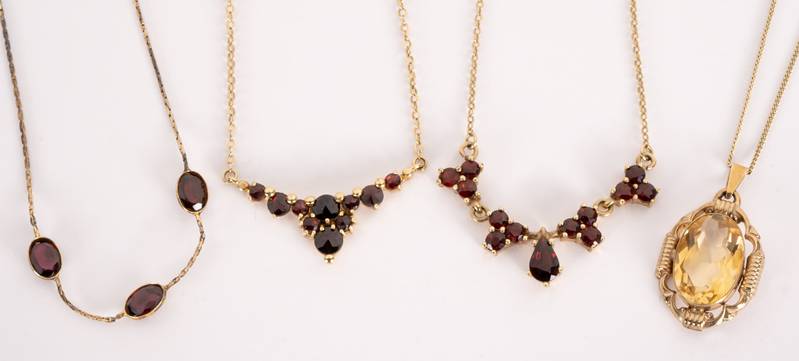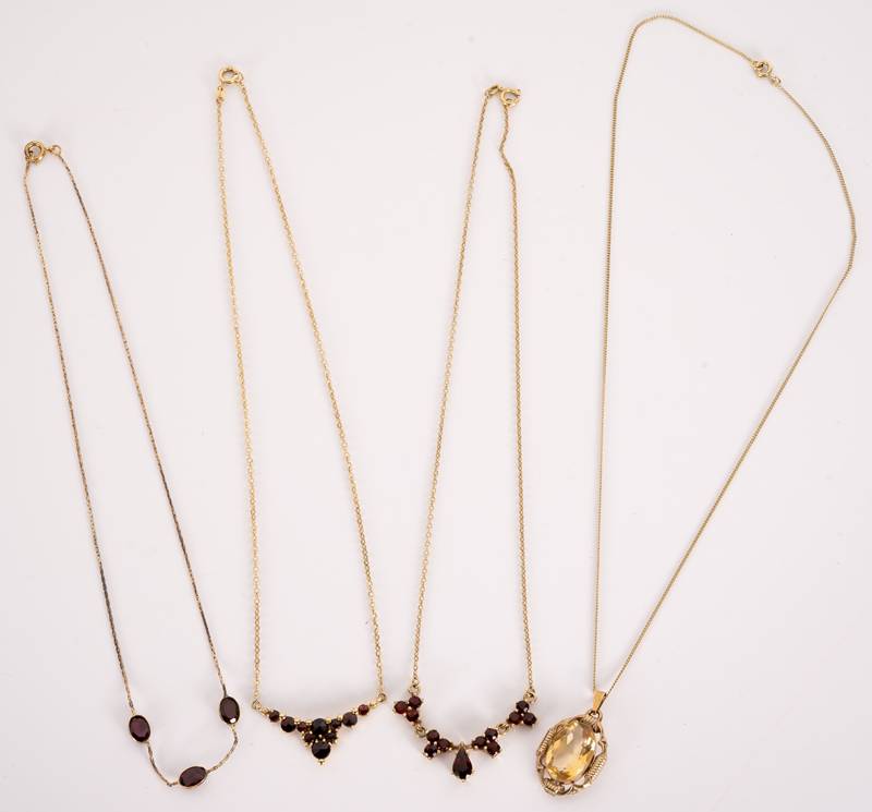 Gold 333. Drei Colliers mit Granatbesatz, eine Kette mit Citrinanhänger. Je punziert. Maximale Länge ca. 46 cm, Gesamtgewicht ca. 15,5 Gramm. (A58)