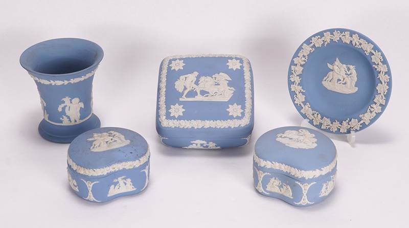 Konvolut Wedgwood England 20. Jh. Jasperware, bestehend aus ca. 5 Teilen. Darunter 3 Deckeldosen, eine Vase sowie ein Zierteller. Jeweils mit Reliefdekor auf blauem Grund. Jeweils unter dem Boden Pressmarke Wedgwood, Made in England.