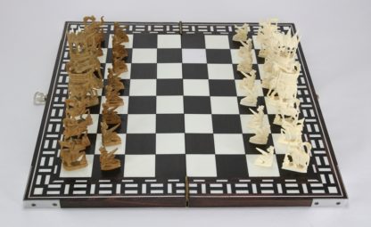 Indien 20. Jh. Bein, ein Satz gefärbt. Passendes Schachbrett. Größe des Bretts ca. 36 x 36 cm, Höhe der Könige ca. 10 cm. Guter Zustand.