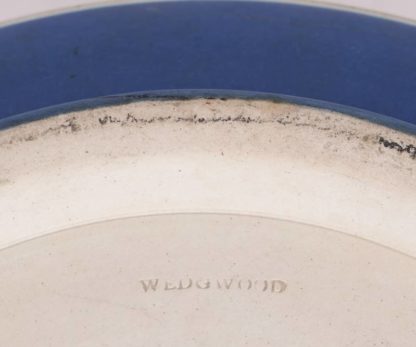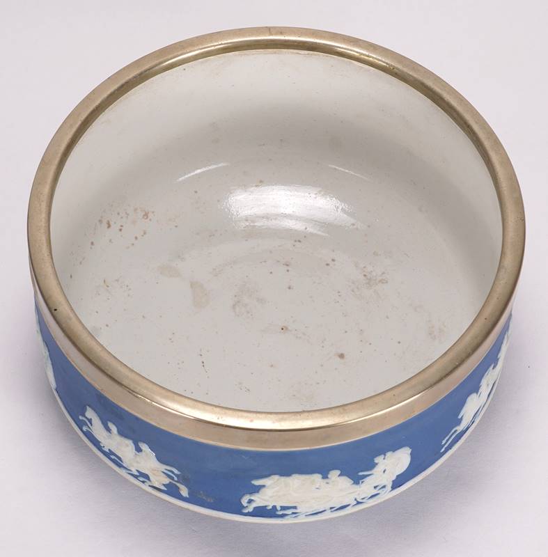 England 20. Jh. Große Salatschale mit Salatbesteck. Schale mit abschließendem silberfarbenem Ring (Alpakasilber), Besteck aus Alpakasilber, mit Keramikgriff. Reliefdekor auf blauem Grund. Unter dem Boden Pressmarke Wedgwood. Schüsselring und Besteck gestempelt EPNS. Durchmesser ca. 23 cm, Höhe ca. 11,5 cm. Besteckgriffe teils best.