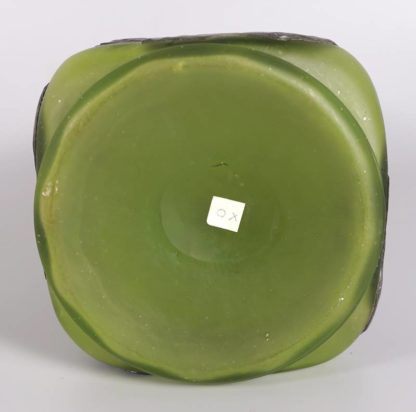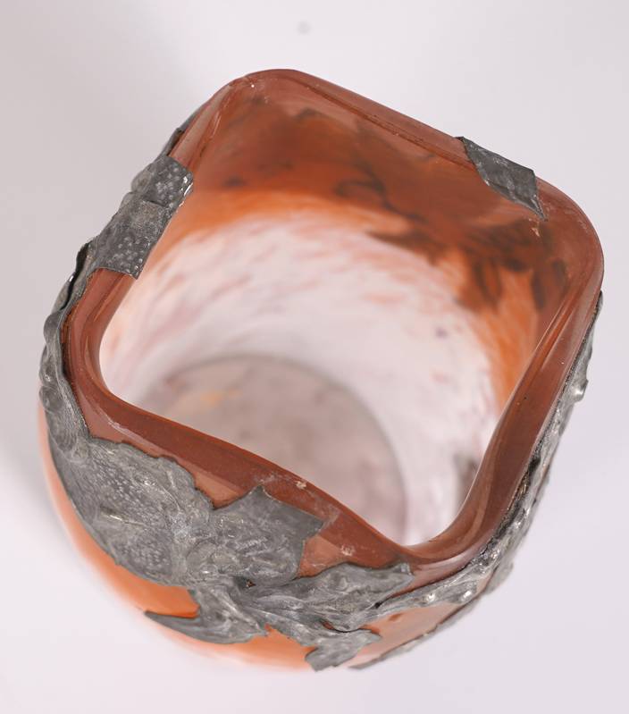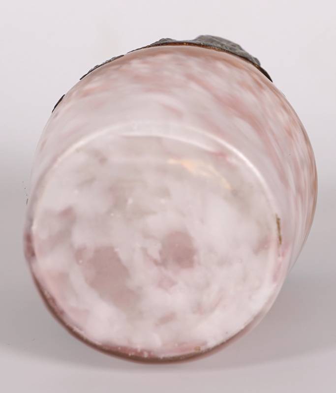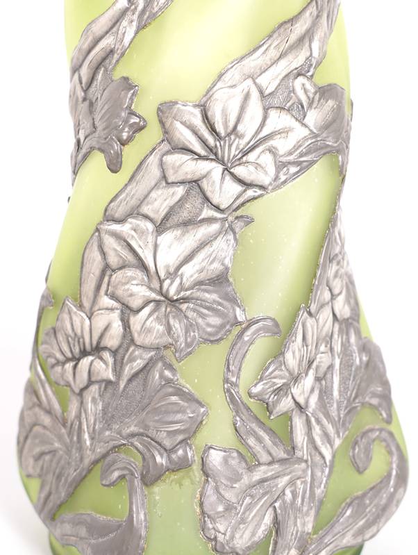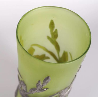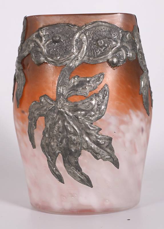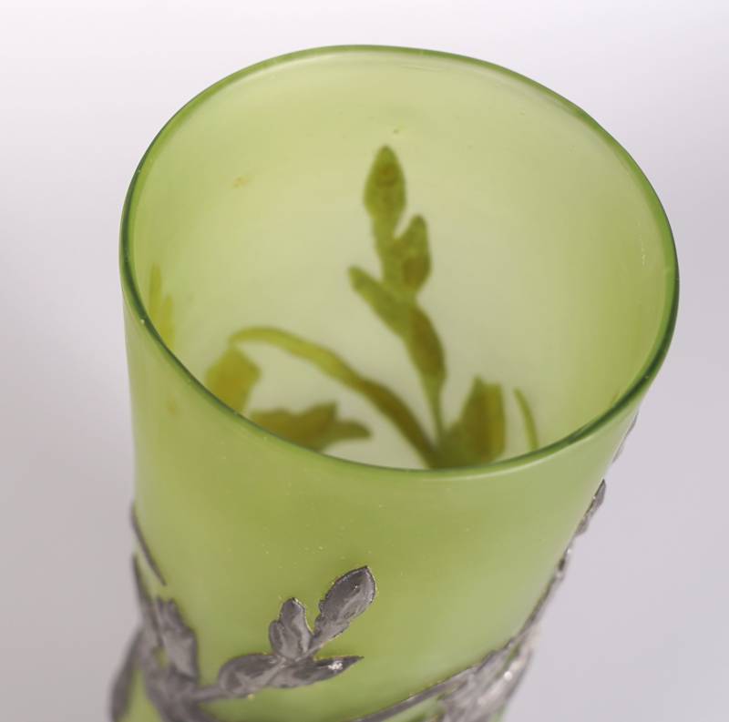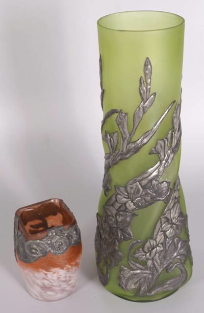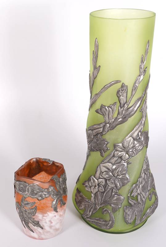 Wohl Frankreich um 1900. Ein grünes gedrehtes Glas und ein kleines Glas mit roséfarbenen Pulvereinschmelzungen, je mit floral gestalteter Zinnmontur. Durchmesser ca. 9/15 cm, Höhe ca. 12/35 cm. Altersbedingter Zustand wie abgebildet.