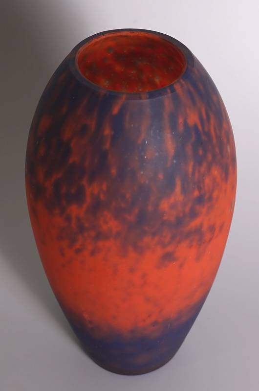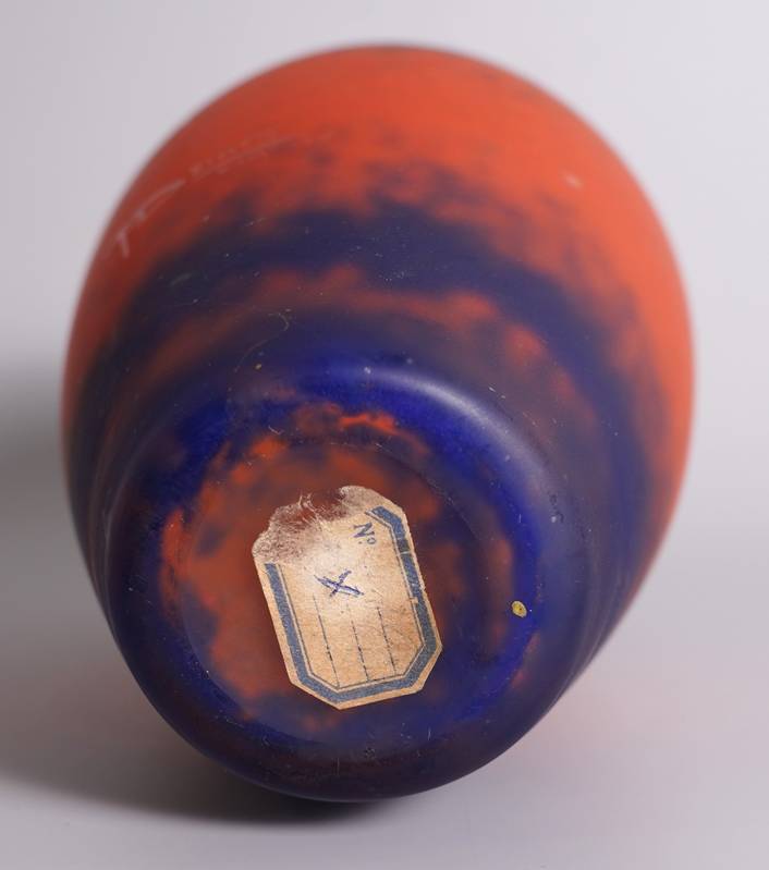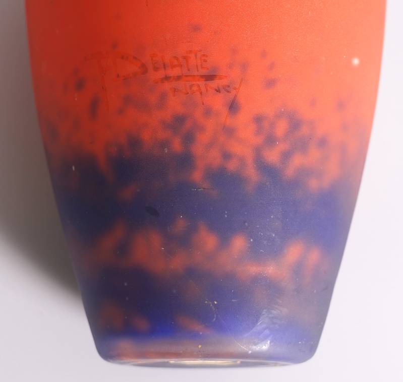 1887 Chatenois - 1953 Toulouse. Farbloses Glas mit kröseliger Pulvereinschmelzungen in Rotorange und Kobaltblau. Wandung säuremattiert. Auf der unteren Wandung bez.: ''ADELATTE NANCY'. Durchmesser ca. 11 cm, Höhe ca. 21 cm. Wandung minimal mit Kratzern.