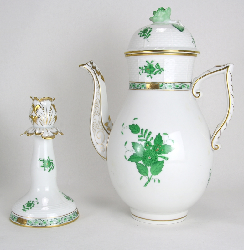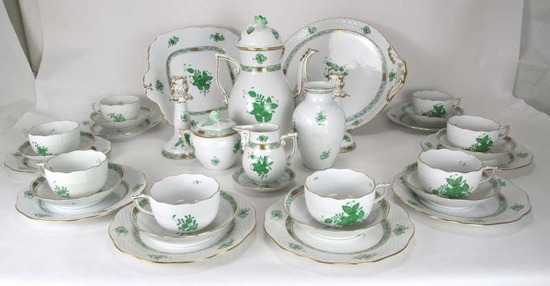 Teeservice Herend Ungarn 20. Jh. Dekor Apponyi in grün mit Goldrand. Ein Teeservice für acht Personen mit Kanne, Zuckerdose, Milchkännchen, einer Vase und zwei Kerzenhaltern. Dazu zwei große Platten.
