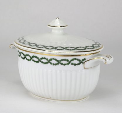 Zuckerdose Hutschenreuther Hohenburg 20.Jh. Porzellan. C.M. Hutschenreuther. Ovale Deckeldose mit umlaufenden Blättergirlande und Goldstaffage. Unter dem Boden grüne Manufakturmarke und Nummern. Größe ca. 16,5 x 8,5 cm, Höhe ca. 10 cm. Knauf leicht berieben.