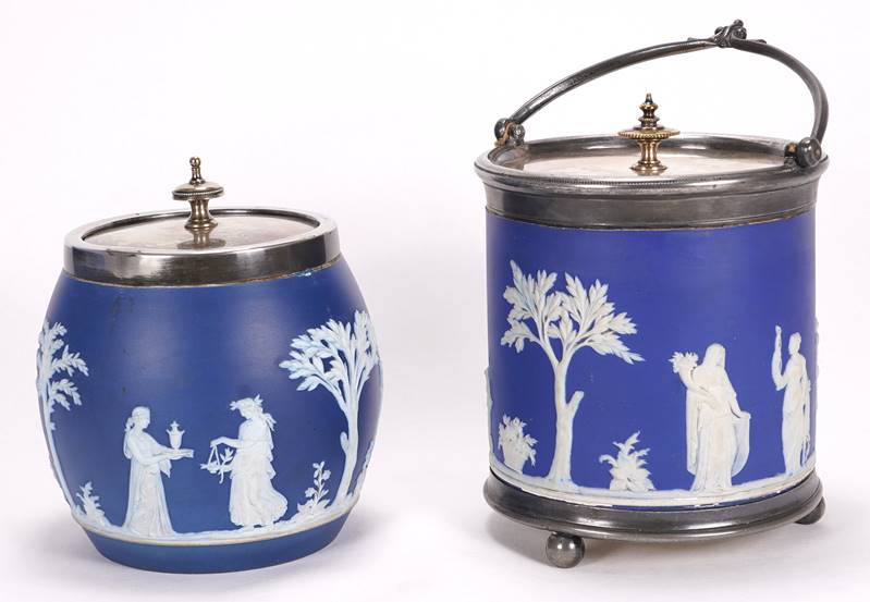 England 20. Jh. Zwei Deckelgefäße aus Jasperware mit Metallmontur. Reliefdekor auf blauem Grund. Ein Deckel gestempelt EPNS. Größe Deckelgefäß mit Henkel ca. 15,5 x 14 cm, Höhe ca. 15,5 cm. Gesamtgewicht ca. 2,2 kg. Kleineres Gefäß altrestauriert.