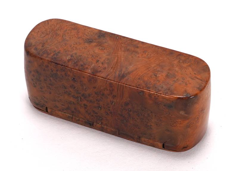 Biedermeier Tabakdose 19. Jh. Birke. Abgerundete Form, aufklappbarer Deckel. Innen verkleidet. Größe ca. 10 x 3,5 cm, Höhe ca. 4,5 cm.