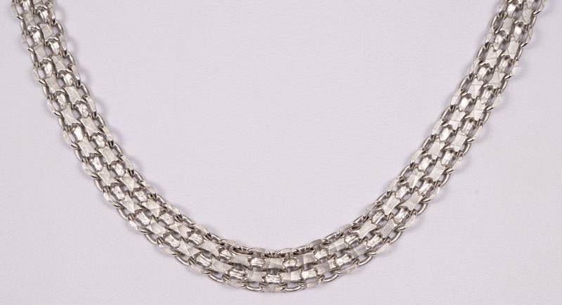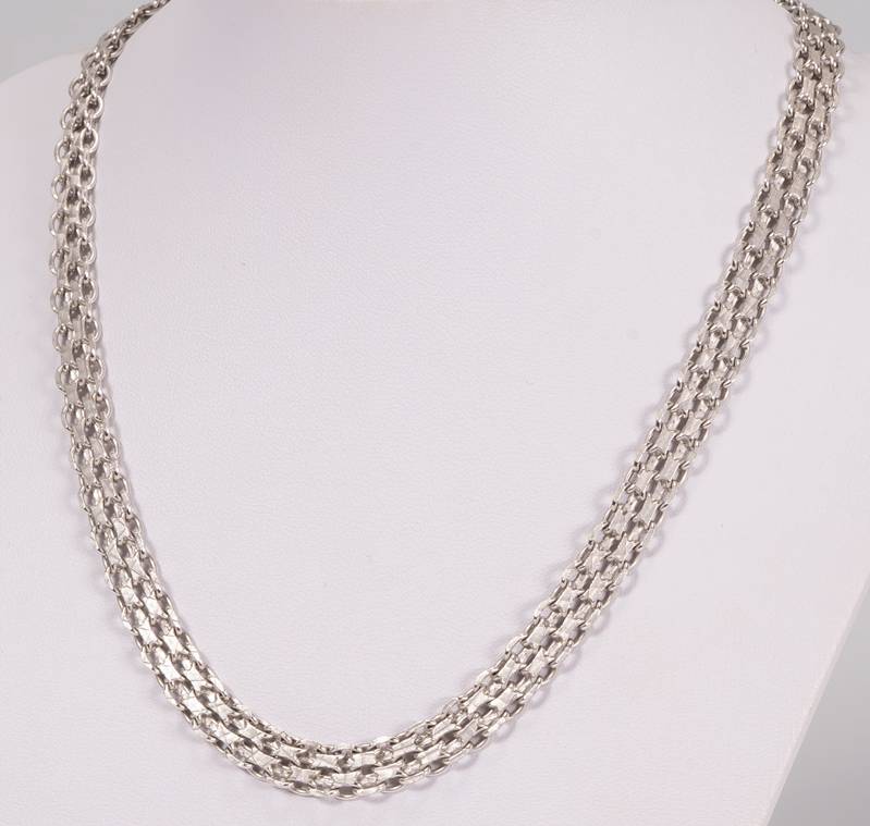 Weißgold 585. Doppeltes Garibaldimuster, Kastenschließe und Sicherungsacht. Auf der Schließe punziert. Länge ca. 44 cm, Gewicht ca. 35 Gramm. (A32)