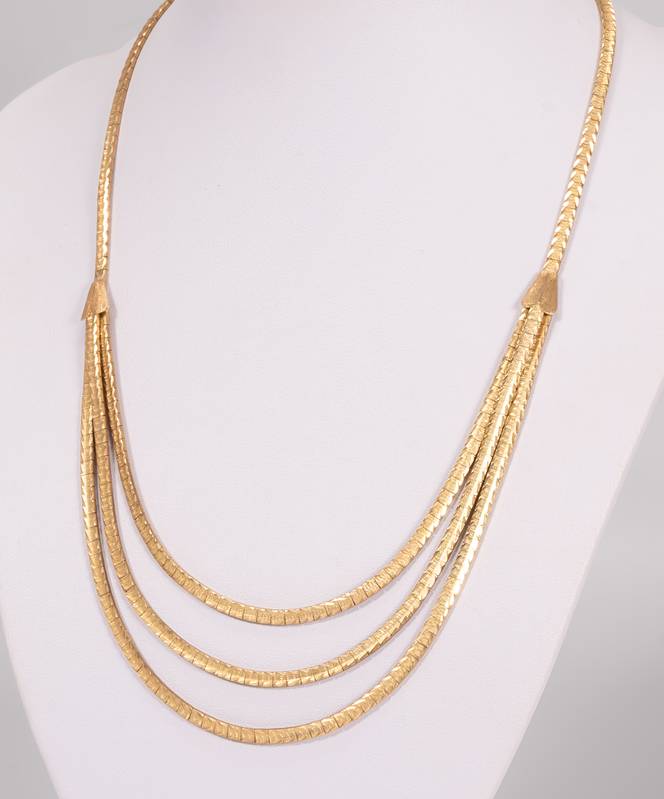 Gelbgold 585. Fantasiemuster mit dreireihigem Mittelteil und Kastenverschluss mit Sicherungsacht. Auf dem Verschluss punziert. Länge ca. 45 cm, Gewicht ca. 31,8 Gramm. (A33)