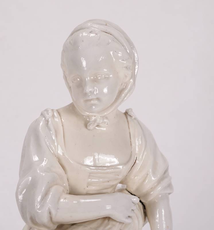 Augarten Wien 18. Jh. Porzellan, gebrochen Weiß. Mädchen mit Ehrenbündel und Blüten unter dem Arm. Unter dem Boden unterglasurblaue Bindeschildmarke sowie Malermonogramm und eingepresste Nummer 47. Größe ca. 13 x 9 cm, Höhe ca. 21 cm. Blüten teils bestoßen, tiefer Riss verso, Glasurverlust auf der Bodenplatte.