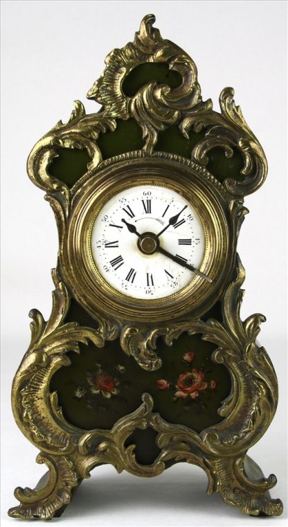 Schweiz um 1900. Floral bemaltes Rokokogehäuse mit Metallapplikationen. Emaillezifferblatt mit arabischer und lateinischer Minuterie und geschwärzten Zeigern. Größe ca. 13 x 6 cm, Höhe ca. 24 cm. Altersbedingter Zustand wie abgebildet, Werk läuft an, Wecker nicht.