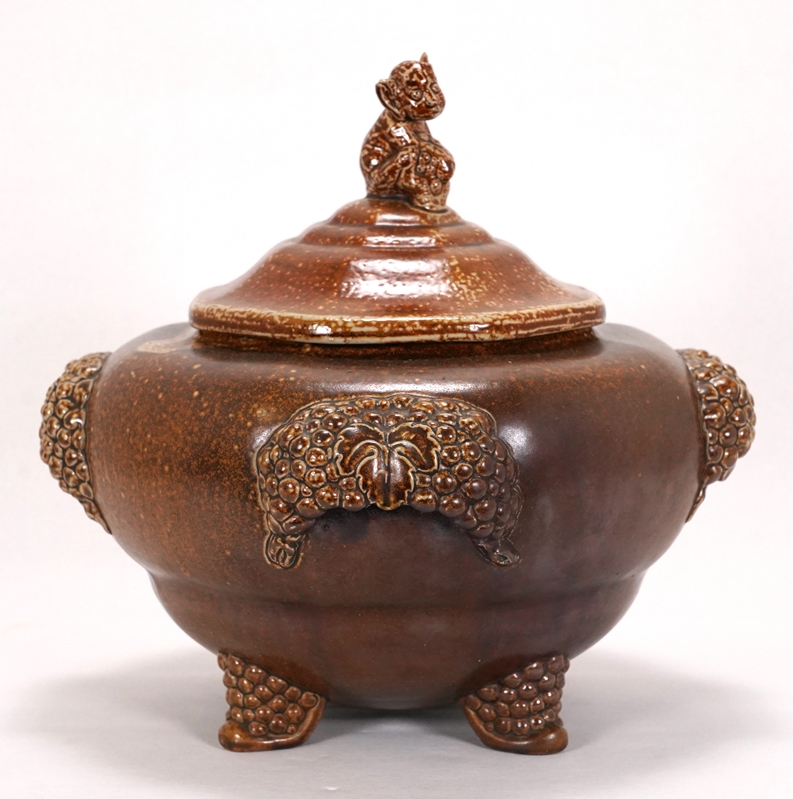 Grenzhausen 20. Jh. Manufaktur Reinhold Merkelbach. Keramik. Auf vier Füßen und mit vier Handhaben je in Traubenform. Auf dem Deckel sitzt ein Fabelwesen. Unter dem Boden Manufakturmarke und Nummerierung 3119. Durchmesser ca. 24 cm, Höhe ca. 27 cm. Ohren des Fabelwesens minimal bestoßen.