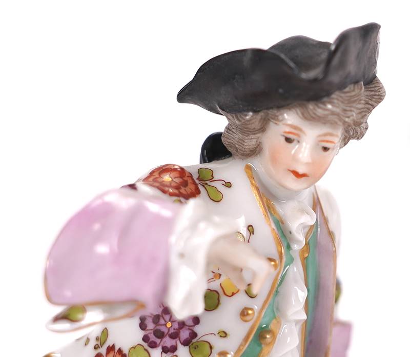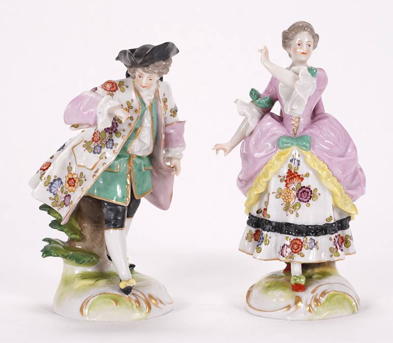 Ludwigsburg 19. Jh. Porzellan polychrom staffiert. Rokoko Kavalier und die passende Dame auf naturalistisch gestaltetem Sockel. Unter dem Boden jeweils unterglasurblaue Manufakturmarke. Höhe je ca. 12 cm. Guter, altersbedingter Zustand, teils Finger gebrochen.