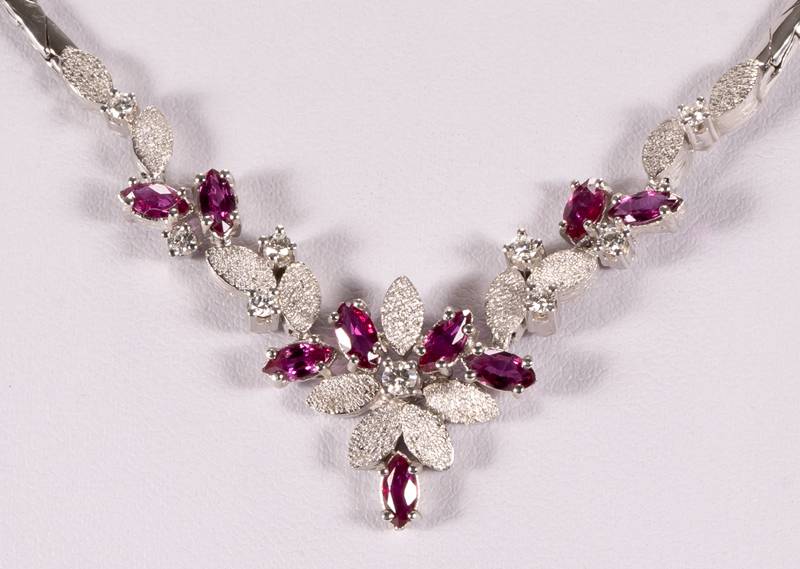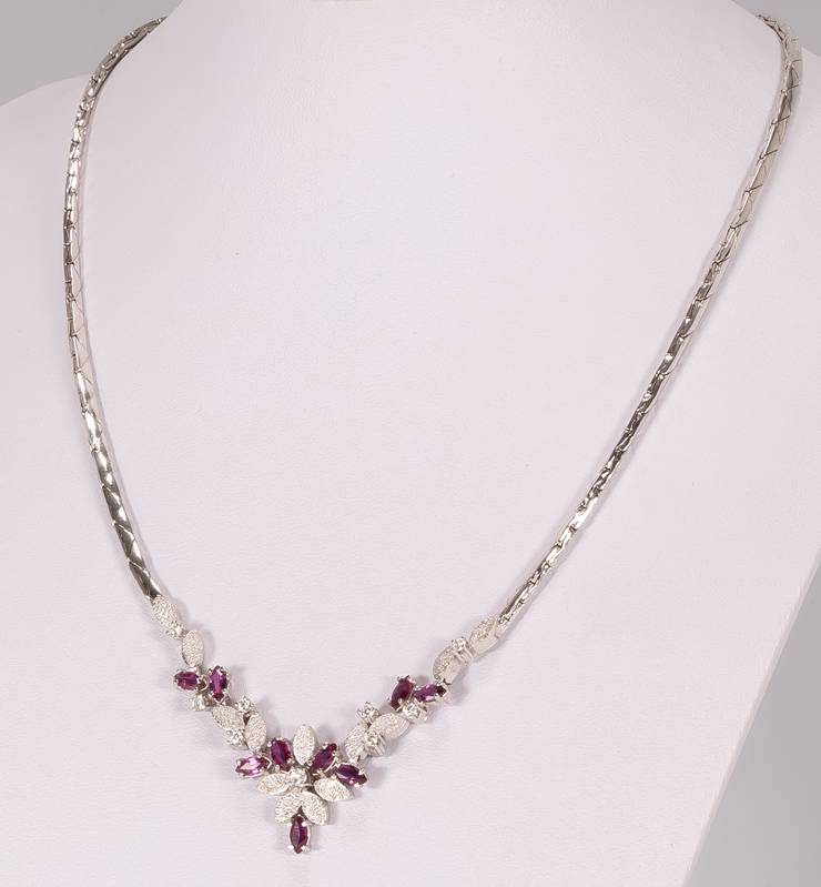 Weißgold 585. Kette im Cobramuster, blumenförmiges Mittelteil mit neun Rubin-Navetten (zusammen ca. 2 Carat) und neun Brillanten (zusammen ca. 0,45 Carat). Kastenschließe mit Sicherungsacht. Auf der Schließe punziert. Länge ca. 45 cm. Gewicht ca. 29,5 Gramm. (A46)