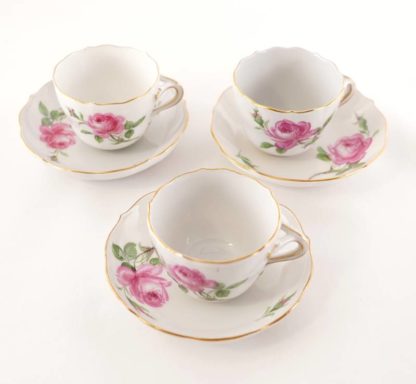 Porzellanmanufaktur Meissen 20. Jh. Form Neuer Ausschnitt, Dekor Rote Rose mit Goldrand. Drei Mokkatassen mit Unteren. Je unter dem Boden unterglasurblaue Schwertermarke, meist mit zwei Schleifstrichen und Beistrich, Formnummer und Malermarke. Durchmesser der Unteren ca. 10,5 cm, Durchmesser der Tassen ca. 6,5 cm, Höhe ca. 5 cm.