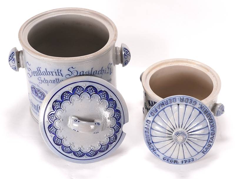 Frühes 20. Jh. Hell glasiertes Steingut mit blauer Schrift. Einmal Kautabak Gebr. Bernard Offenbach a.M., unter dem Boden bezeichnet J.W. Remy Höhr, einmal Senffabrik Haslach i.K. Schaettgen-Ruedin, unter dem Boden mit Herstellermarke und Nummerierung. Maximaler Durchmesser ca. 22 cm, Höhe ca. 29 cm. Tabaktopf an der Öffnung minimal eingerissen.