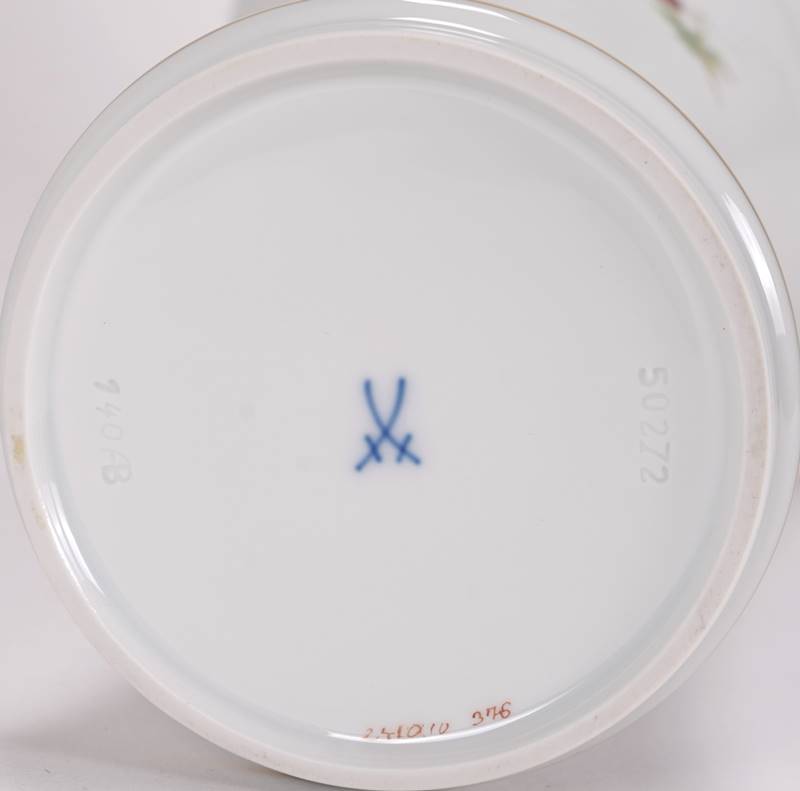 Tischvase Meissen Porzellanmanufaktur Meissen 20. Jh. Flötenform mit Obstbouquet und Goldrand. Unter dem Boden unterglasurblaue Schwertermarke, 1. Wahl, sowie Formnummern und Malermarke. Durchmesser ca. 13 cm, Höhe ca. 26 cm.
