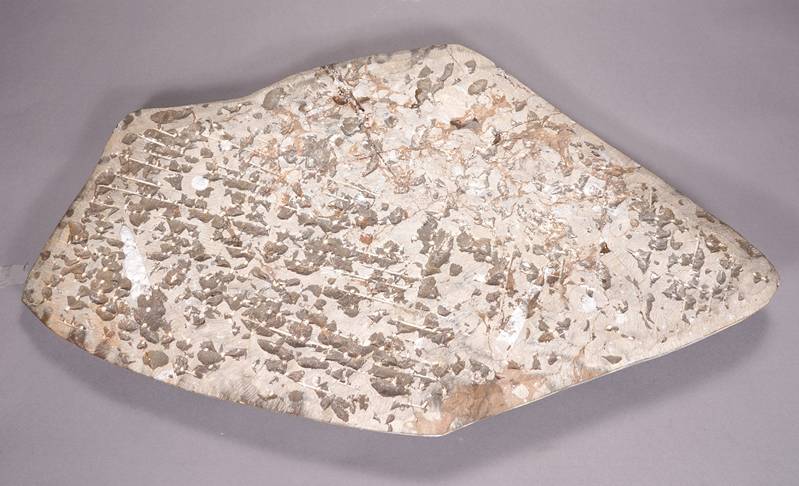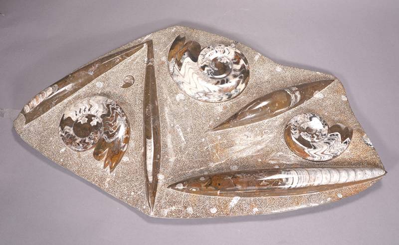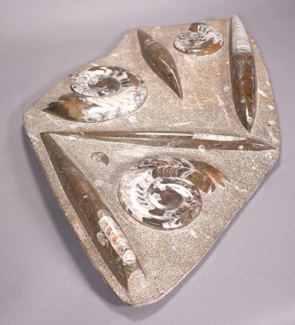 Natursteinplatte mit Schneckentieren und Orthoceras. Größe ca. 80 x 47 cm, Gewicht ca. 16,1 kg.