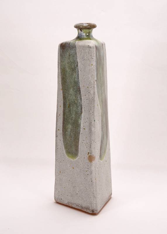 Kerstan, Horst 1941 Frankfurt - 2005 Kandern. Vase. Rotbrauner Scherben mit Glasur in Weiß und Grün. Dreiseitiger Korpus mit eingezogener Öffnung. Unter dem Boden signiert. Durchmesser ca. 10 cm, Höhe ca. 35 cm. Aus einer umfangreichen Markgräfler Kunstsammlung.