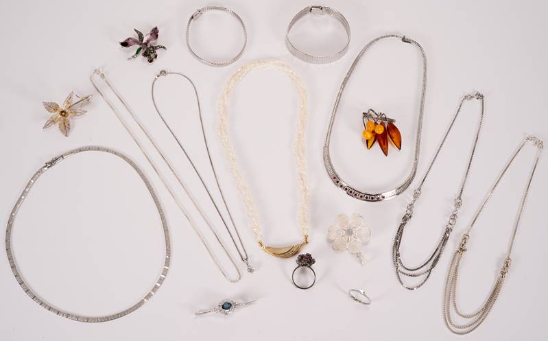 Silber 800-925, teils punziert, teils geprüft. Zwei Armbänder, vier Colliers, zwei Ketten (einmal mit Anhänger), zwei Damenringe, ein Anhänger, vier Broschen und eine Süßwasserzuchtperlenkette. Teils mit Besatz. Gesamtgewicht ca. 155 Gramm. Bitte selbst besichtigen. (A62)