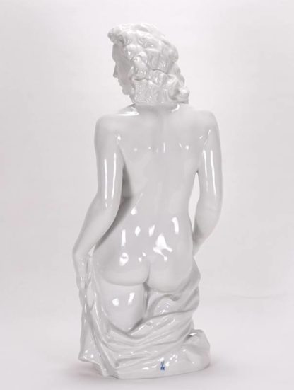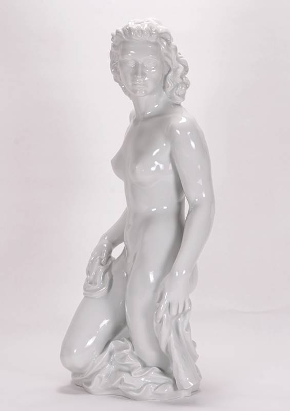 Der Frühling Meissen Porzellanmanufaktur Meissen 20. Jh. Porzellan. Knieender, weiblicher Akt. Nach einem Modell von Robert Ullmann. Unten am Sockel unterglasurblaue Schwertermarke mit drei Schleifstrichen sowie Bezeichnung Kop. n. Robert Ullmann. Unter dem Boden geritzte Schwertermarke weiß sowie Formnummer Q 297 und weitere Nummerierungen. Größe ca.22 x 19 cm, Höhe ca. 51 cm. Gewicht ca. 4,3 kg. Minimale dunkele Ascheeinsprenkelungen, kleinere Fehlstellen, wohl Brennfehler. Aus einer umfangreichen, süddeutschen Privatsammlung.