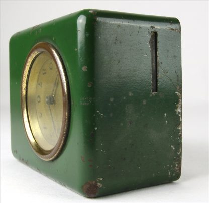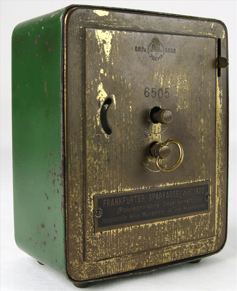 JGEHA, Slowakei um 1920. Metallgehäuse mit Uhr und Geldfach. Hinten Plakette der Frankfurter Sparkasse. Größe ca. 8 x 5,5 cm, Höhe ca. 10,5 cm. Altersbedingter Zustand wie abgebildet, Werk läuft nicht, Schlüssel schließt nicht auf.