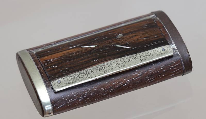 Tabakdose Frankreich um 1900. La San-Claudienne. Holzkorpus mit Metallmonturen. Auf dem Griff bezeichnet. Größe ca. 2,5 x 8,5 x 4,5 cm.