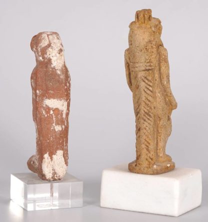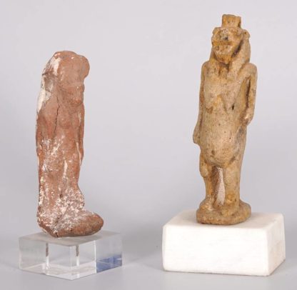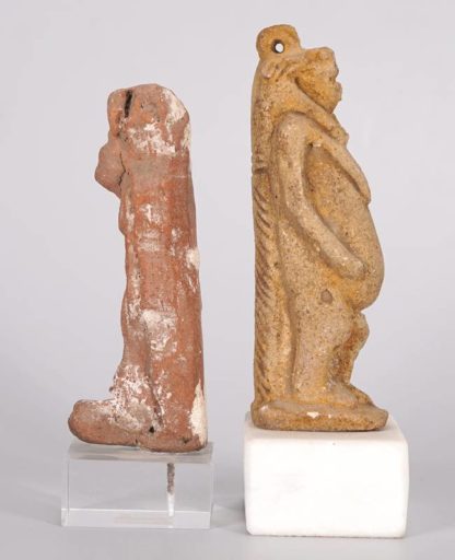 Ägypten wohl Spätzeit. Fayence. Ein Amulett der Taweret und eine weibliche Figur. Einmal auf Steinsockel, einmal auf Plexiglas. Größe ca. 4 x 3 cm, Höhe ca. 10 cm. Teils berieben und stärker bestoßen. Altersbedingter Zustand wie abgebildet. Aufgrund der schwierigen Sachlage kann keine Garantie für Herkunft oder Alter übernommen werden. Bitte besichtigen Sie selbst. Wir machen darauf aufmerksam, dass dieser Gegenstand nicht aus Deutschland ausgeführt werden darf.
