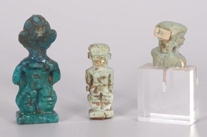 Amulett Pataikos Ägypten wohl Spätzeit. Fayence, mit Resten blauer Glasur. Ein Amulett des Zwergengottes Pataikos sowie zwei weitere Amulette, wohl ebenfalls Pataikos. Einmal auf Plexiglas. Maximale Größe ca. 1,5 x 1 cm, Höhe ca.4,1 cm. Teils berieben und stärker bestoßen. Altersbedingter Zustand wie abgebildet. Aufgrund der schwierigen Sachlage kann keine Garantie für Herkunft oder Alter übernommen werden. Bitte besichtigen Sie selbst. Wir machen darauf aufmerksam, dass dieser Gegenstand nicht aus Deutschland ausgeführt werden darf.