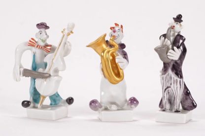 Clownskapelle Meissen Porzellanmanufaktur Meissen Ende 20. Jh. Drei Porzellanfiguren aus der Clownskapelle, polychrom gefasst, teils mit Goldstaffage. Nach einem Entwurf von Peter Strang von 1994. Drei Clowns auf quadratischem Sockel mit je einem Instrument. Saxofon, Kontrabass und Tuba. Signatur jeweils auf dem Sockel P.S. Jeweils unter dem Boden unterglasurblaue Schwertermarke, 1. Wahl, Formnummer sowie weitere Nummerierungen. Maximale Größe ca. 5 x 2,5 cm, Höhe ca. 8 cm.