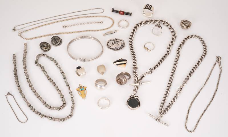 Silber 800-925, meist punziert. Acht Ringe, teils mit Diamanten besetzt, drei Ketten, drei Uhrenketten, zwei Broschen, zwei Anhänger, ein Paar Ohrringe, ein Armband und einiges mehr. Teils mit Steinen besetzt. Gesamtgewicht ca. 320 Gramm. Bitte selbst besichtigen.