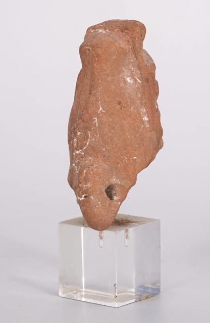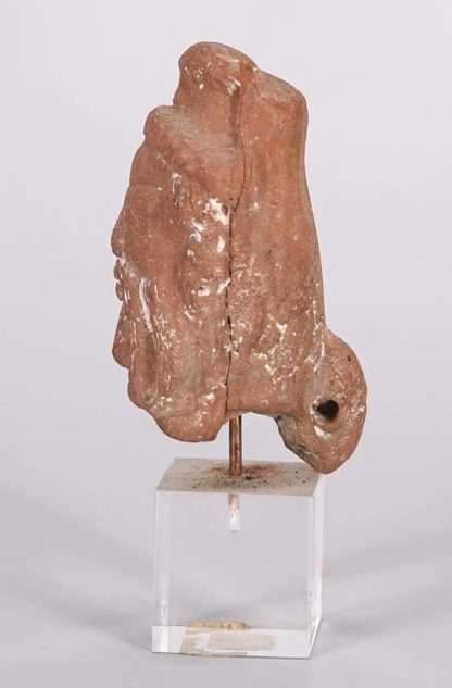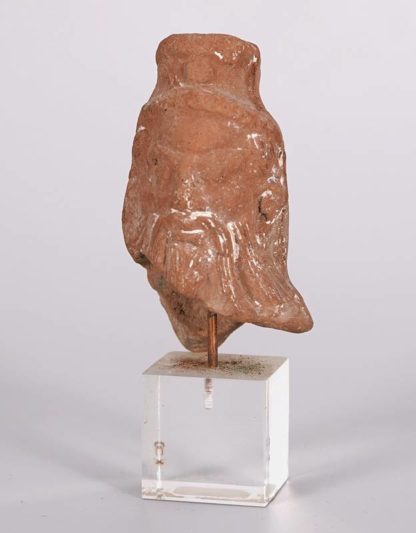 Ägypten um 200 n. Chr. Terrakottakopf des Gottes der Fruchtbarkeit auf Plexiglassockel. Unter dem Boden mit Sammleretikett. Größe ca. 3 x 3,5 cm, Höhe ca. 7,5 cm. Teils berieben und stärker bestoßen. Altersbedingter Zustand wie abgebildet. Aufgrund der schwierigen Sachlage kann keine Garantie für Herkunft oder Alter übernommen werden. Bitte besichtigen Sie selbst. Wir machen darauf aufmerksam, dass dieser Gegenstand nicht aus Deutschland ausgeführt werden darf.