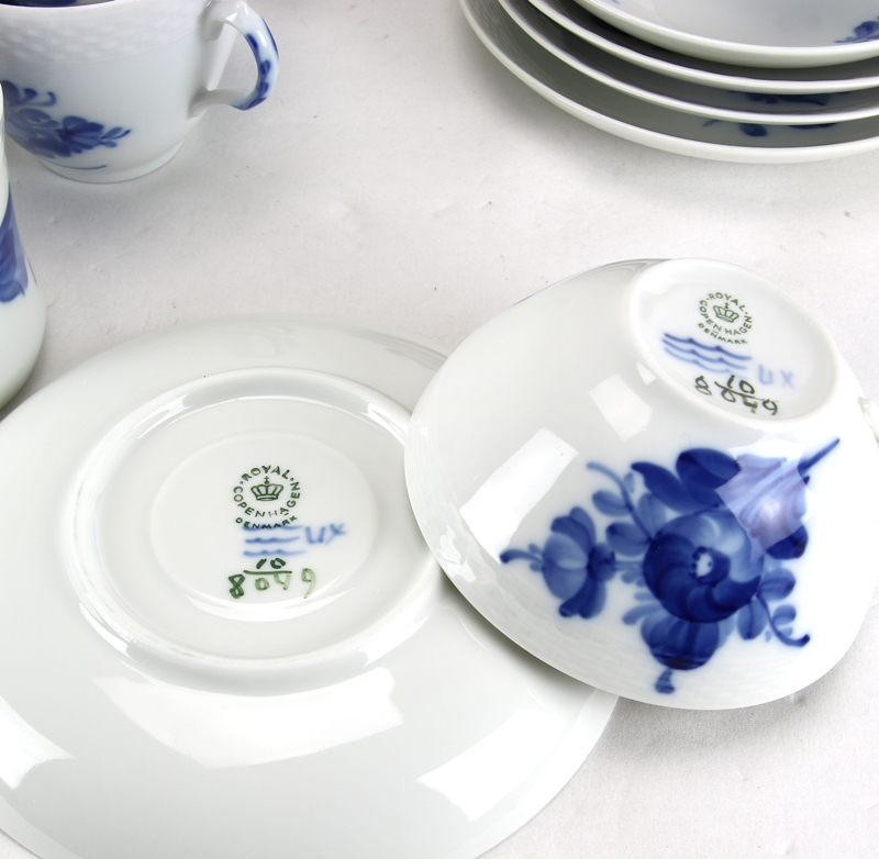 Dänemark 20. Jh. Royal Copenhagen. Porzellan mit Blaumalerei. Dekor blaue Blume glatt mit Reliefrand. Sechs Mokkatassen (Höhe ca. 6 cm) mit Unteren (Durchmesser ca. 13,5 cm) und sechs Konfektteller (ca. 16 cm). Dabei vier weitere Konfektteller, sechs diverse Untere, zwei Kaffeetassen und zwei Teetassen sowie ein Teebeutelbehälter (Höhe ca. 7 cm). Unter dem Boden je unterglasurblaue- bzw. grüne Manufakturmarke, Formnummern bzw. Malermarken. Insgesamt 33 Teile. Guter Zustand.