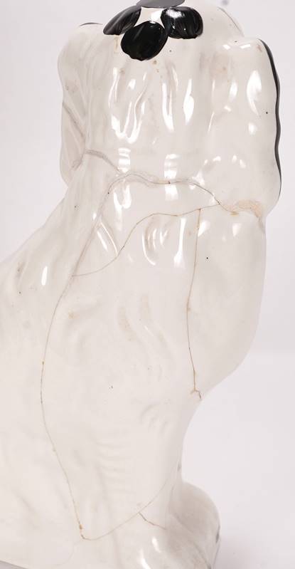 England Staffordshire 20. Jh. Arthur Wood. Keramik. Zwei sitzende Cavalier King Charles Spaniel, weiß mit schwarzem Muster auf der Vorderseite. Augen gelb, Schnauze Rot, mit Goldstaffage. Unter dem Boden jeweils eingepresst England Wood und gestempelte Modellnummer 4558 und geschrieben A. Größe ca. 21 x 10 cm, Höhe ca. 29 cm. Eine Figur mehrfach geklebt und restauriert. Beide mit Craquelée.