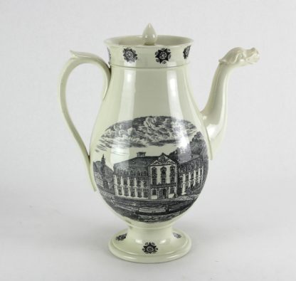 Kaffeekanne Schramberg Schramberg 19. Jh. Hell glasierte Keramik. Leicht bauchige Kanne mit Schwanenausguss und versenktem Deckel. Eine Umlaufverzierung aus schwarzen, sternförmigen Blumen auf dem Fuß, dem oberen Rand und dem Deckel sowie eine Abbildung des Schlosses Scraberg und des Dorfes Aldorf auf der Wandung. Unter dem Boden Pressmarke Schramberg. Größe ca. 20 x 14 cm, Höhe ca. 24 cm. Guter Zustand.