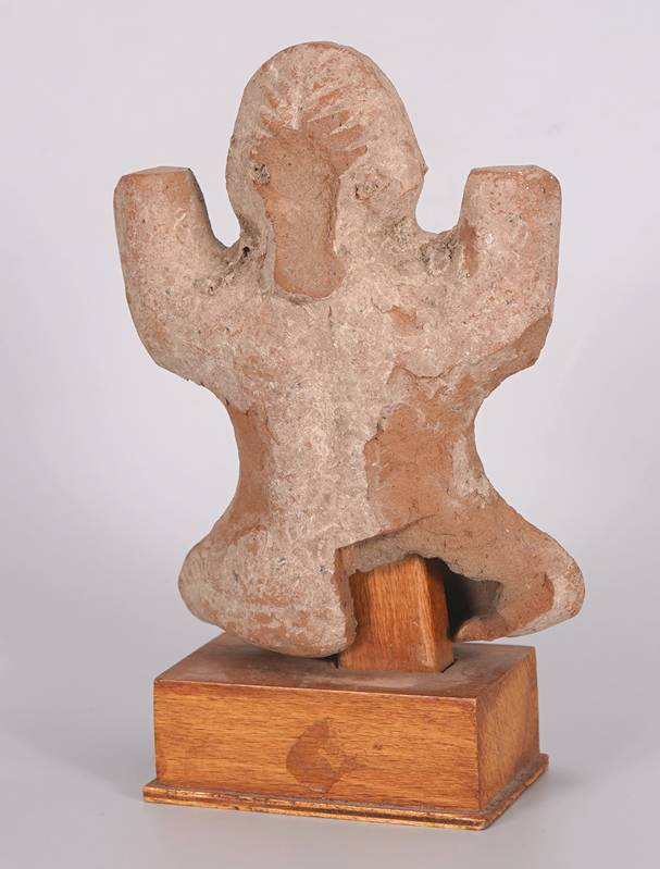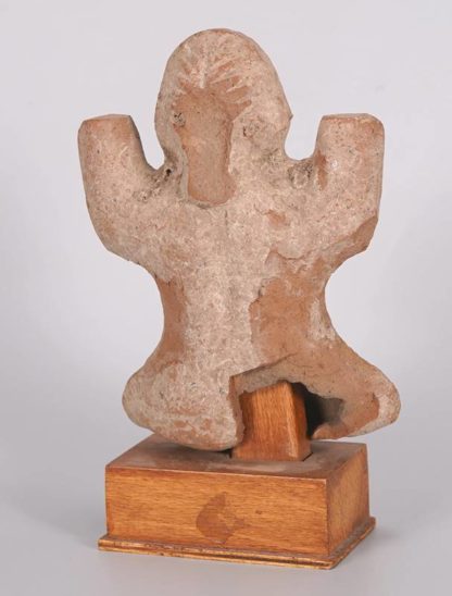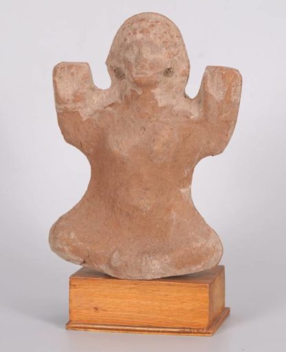 Wohl Ägypten, frühe römische Kaiserzeit. Terrakotta. Figur mit erhobenen Armen auf Holzsockel. Größe ca. 9 x 4,5 cm, Höhe ca. 16 cm. Teils berieben und stärker bestoßen. Altersbedingter Zustand wie abgebildet. Aufgrund der schwierigen Sachlage kann keine Garantie für Herkunft oder Alter übernommen werden. Bitte besichtigen Sie selbst. Wir machen darauf aufmerksam, dass dieser Gegenstand nicht aus Deutschland ausgeführt werden darf.