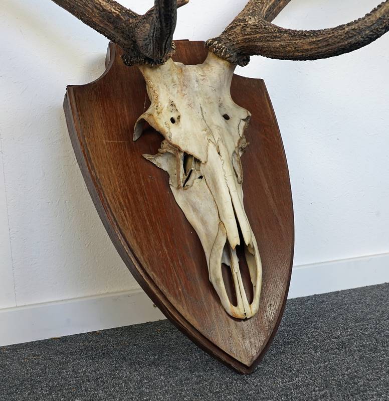 Große Hirschtrophäe Deutsch 20. Jh. Ungerader Vierzehn-Ender mit Schädelplatte. Größe ca. 110 x 64 cm, Höhe ca. 120 cm. Gewicht ca. 9,5 kg. Zustand wie abgebildet. Versand nicht möglich, nur Abholung.