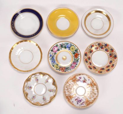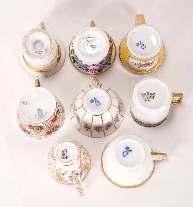 Konvolut Mokkatassen Acht Mokkatassen mit Unteren. Verschiedene Hersteller wie KPM, Fürstenberg und Nymphenburg. Jeweils unter dem Boden mit Marke. Durchmesser der Unteren ca. 10,5 cm. Teils bestoßen.