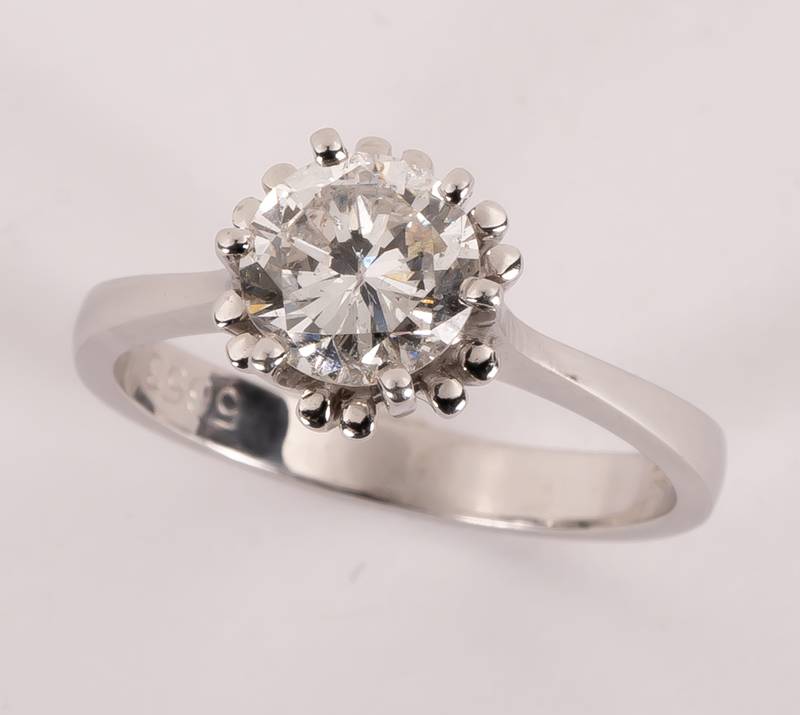 Weißgold 750. Brillantsolitär (ca. 1,2 Carat, untere Reinheits- und mittlere Farbqualität) in hoch aufgebauter Krappenfassung. In der Ringschiene punziert. Ringgröße ca. 56/17,5, Gewicht ca. 10,1 Gramm. (Kl2)