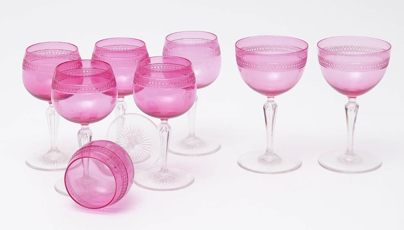 Zylindrische Form mit vegetabil durchbrochen gearbeiteter Wandung. Geschwungener Ohrenhenkel. Glaseinsätze mit unterschiedlichem Schliff- und Ätzdekor. Metall, versilbert. Höhe ca.10 cm; Acht Sherrygläser. Auf rundem Standfuß mit großem Bodenstern facettierter Hohlbalusterschaft mit gezahnten Kanten. Sechs kugelige, zwei halbkugelige Kuppas aus hellrotem Rubinglas mit geometrischem Zierschliff. Höhe ca 12 bzw. 12,5 cm. Acht Champagnerschalen um 1900. Auf rundem Standfuß facettierter Schaft mit Scheibennodus. Halbkugelige Kuppa. Höhe ca.10,5 cm. Eine mit Chip am Fuß.