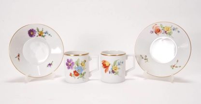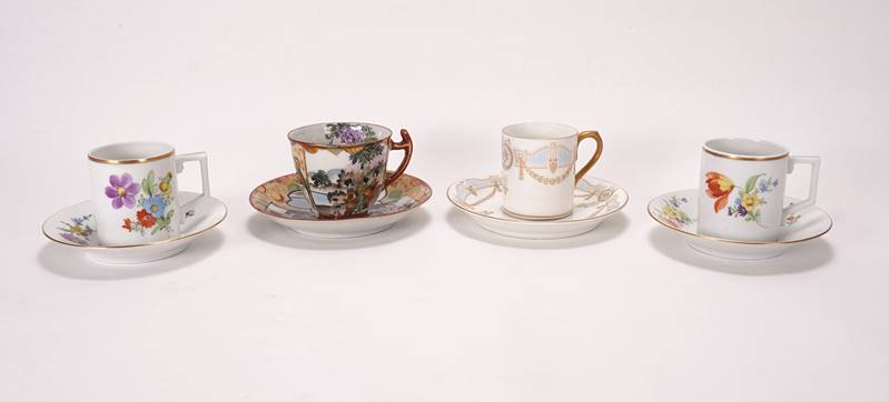 Insgesamt vier Tassen mit Unteren von diversen Herstellern. Porzellan, polychrom gefasst, teils mit Goldstaffage. Zwei mal Porzellanmanufaktur Höchst mit Blumenmalerei. Einmal mit japanischen Motiven. Einmal im Empire Stil. Jeweils unter dem Boden gemarkt. Teils berieben. Zustand wie abgebildet, bitte selbst besichtigen.