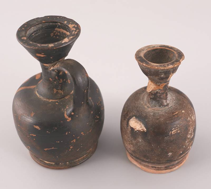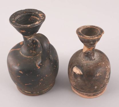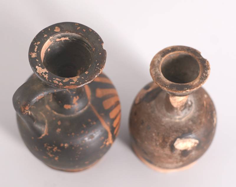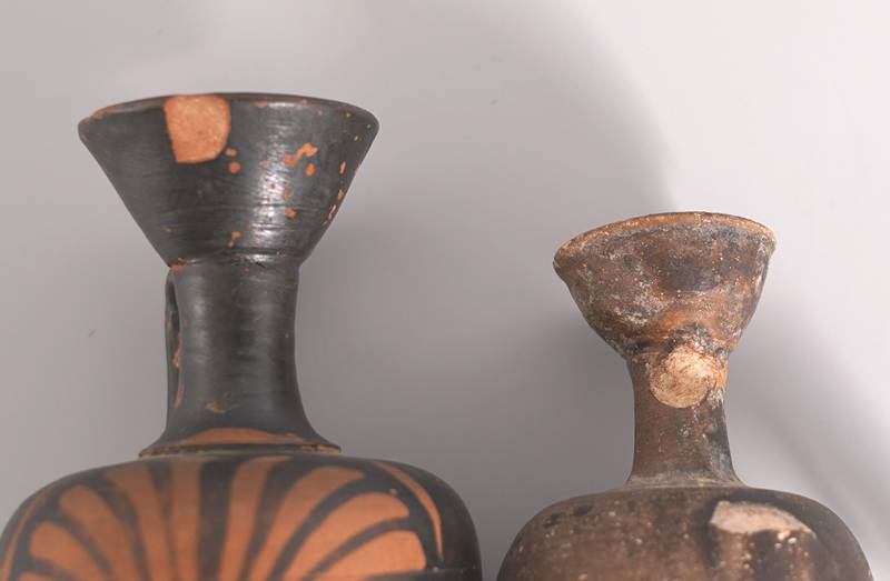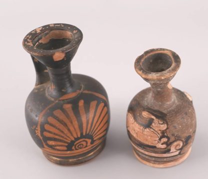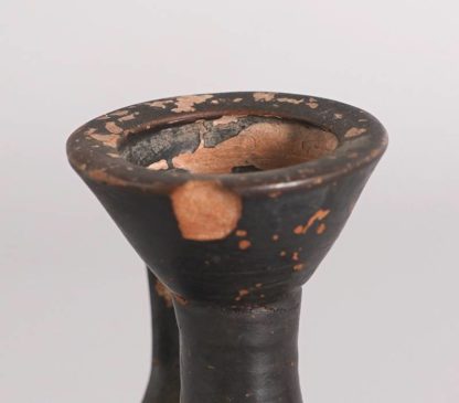 Wohl griechisch ca. 300 v. Chr. Rötlicher Scherben, schwarz und rot gefasst. Maximaler Durchmesser ca. 5,5 cm, Höhe ca. 9 cm. Teils berieben und stärker bestoßen. Altersbedingter Zustand wie abgebildet. Aufgrund der schwierigen Sachlage kann keine Garantie für Herkunft oder Alter übernommen werden. Bitte besichtigen Sie selbst. Wir machen darauf aufmerksam, dass dieser Gegenstand nicht aus Deutschland ausgeführt werden darf.