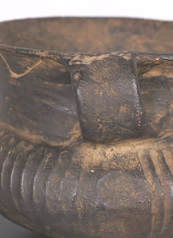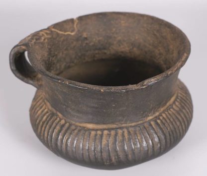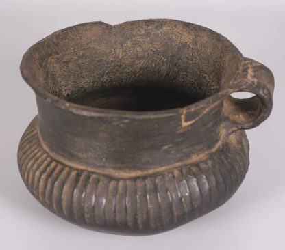 Wohl Lausitzer Kultur, Bronzezeit. Dunkler Ton. Umlaufender Rillendekor an bauchiger Wandung, eingezogener Hals und kleine Handhabe. Durchmesser ca. 12,5 cm, Höhe ca. 10 cm. Teils berieben und stärker bestoßen. Altersbedingter Zustand wie abgebildet. Aufgrund der schwierigen Sachlage kann keine Garantie für Herkunft oder Alter übernommen werden. Bitte besichtigen Sie selbst. Wir machen darauf aufmerksam, dass dieser Gegenstand nicht aus Deutschland ausgeführt werden darf.