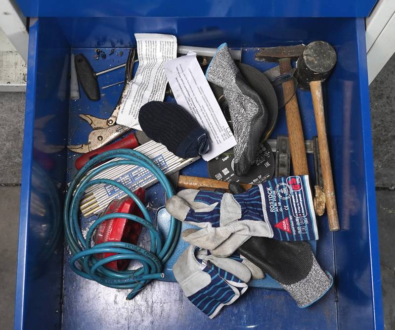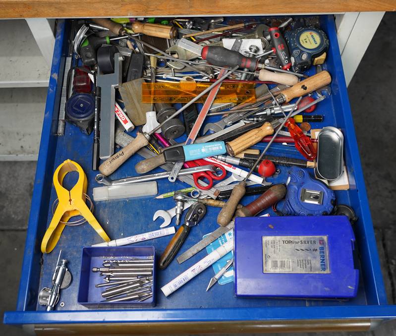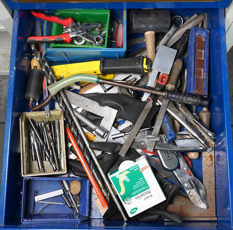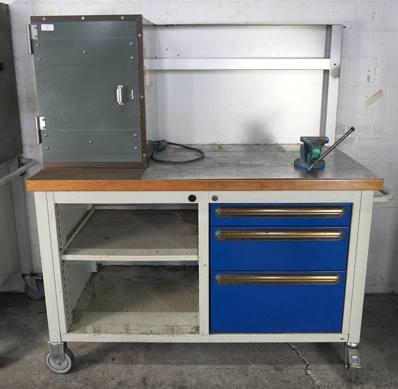 Werkzeugwagen Rollbar mit einem aufgebauten Schrankelement, drei Schubladen mit reichhaltigem Werkzeuginhalt. Ca. 140 x 70 cm.