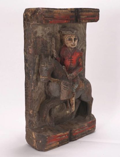 Wohl 17. Jh. Holz geschnitzt, polychrom gefasst. Relief eines Reiters auf einem schreitenden Pferd. An der Flanke des Tieres ist eine Trommel, den Schlägel dazu hält der Reiter in seiner Linken, in seiner Rechten hält er einen Stab, sein Blick führt zum Betrachter. Oben und unten wird das Relief von hervorspringenden, kannelierten Leisten gerahmt. Verso handschriftlich bezeichnet oder datiert 1518. Größe ca. 37 x 24 cm, Gewicht ca. 2,1 kg. Teils Farbverlust. Zustand wie abgebildet.