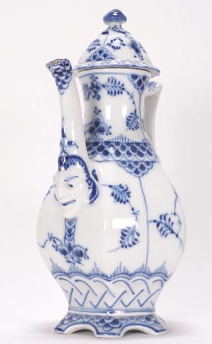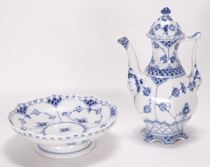 Mokkaservice Royal Copenhagen Königlichen Porzellanmanufaktur, Kopenhagen, 20. Jh. Musselmalet Vollspitze. Für 8 Personen mit Mokkakanne, Mokkatasse auf Unterem und einer Gebäckschale auf Fuß. Jeweils unter dem Boden unterglasurgrüne Manufakturmarke, unterglasurblaue Wellenmarke sowie Nummerierung. Größe der Kanne ca. 13 x 11 cm, Höhe ca. 22 cm. Zwei Untere minimal bestoßen.